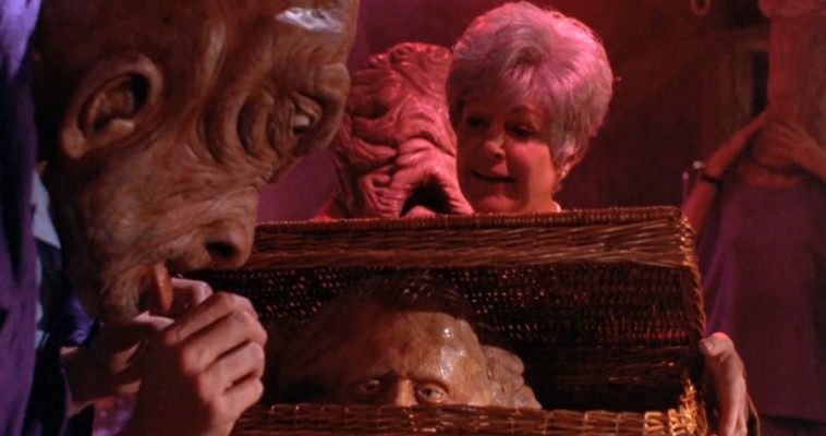 Picking up right after the events of part one, BASKET CASE 2 (1990) sees the Bradley boys whisked straight from hospital and into the care of Granny Ruth. Quirkily essayed by jazz singer Annie Ross, Ruth is an unflappably positive mother hen to an assortment of other “unique individuals” – Dawn of the Dead‘s (1978) David Emge among them, albeit unrecognisable beneath Gabe Bartalos’ imaginative freak make-up. The now sleeker, redesigned Belial, of course, is naturally at home in such a protective and nurturing environment, and Henenlotter’s rousing parable of individuality and tolerance is built around how at ease he becomes in his own lumpen skin. Duane, meanwhile, grows increasingly uncomfortable; Henenlotter over-eggs the existentialism a touch but he always makes sure a ghoulish punchline is never far behind.