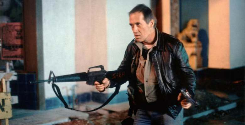 Entering the Roths’ bar — a watering hole ran by Clay’s older brothers Jim (David Carradine) and Tommy (Brent Huff) — Burt’s got the grinning Thorton’s measure: he snarls when the dick mentions a business deal with Tanaka, rightly describing the oyabun as a gangster and a lowlife. But though as loyal and courageous, Clay lacks Burt and his brothers’ cynicism towards anyone who isn’t family, Jim’s mistrust compounded by his harrowing experiences in Vietnam. Instead, Clay wants to fly further from the nest and forge his own path. Thorton’s rookie partner, the junior Roth becomes his patsy when the snoop shafts Tanaka over. Hiring Thorton and Clay to oversee the safe return of a small statue — a MacGuffin that stands as Ray’s explicit nod to The Maltese Falcon (1941), a key influence in Armed Response’s Noir-ish tableaux — the exchange between them and the thieves (Laurene Landon and Dick Miller) goes south when Thorton decides to keep the bust AND the $1million ransom. It’s a great sequence. Tense, well done, and funny in a dark, what we’d now term ‘Coen-esque’ way, the sight of Landon going haywire with a whopping machine gun before being blasted square in the boob is jaw-dropping schlock cinema, and, as obvious it may be in terms of plot mechanics, Thorton hastily popping Clay in the gut is a mean little do-over.