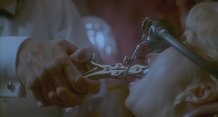 However, it’s Yuzna’s dollops of dark comedy that render The Dentist so terrifically watchable. Boasting a chunky, sun-soaked sheen and a parpy, Herrmann-tipping electronic score by Alan Howarth, The Dentist’s technical nuts n’ bolts are excellent in and of themselves, but they serve a greater purpose: they’re deliberately at odds with the nastier and inherently upsetting elements, their juxtaposition a key component in Yuzna’s deft ability to conjure an atmosphere of unease and toe-curling tension. And though Yuzna keeps an admirably straight face, preventing The Dentist from descending into outright camp or parody (which it could have done in lesser hands), he does wink in the direction of the kitsch, the trashy, and the lurid, lacing this portrait of narcissism and self-inflicted pressure with an exaggerated, pantomime quality that makes the dark psychological stuff and weird leeriness that permeates the film all the more powerful because they’re so perversely enjoyable to experience.