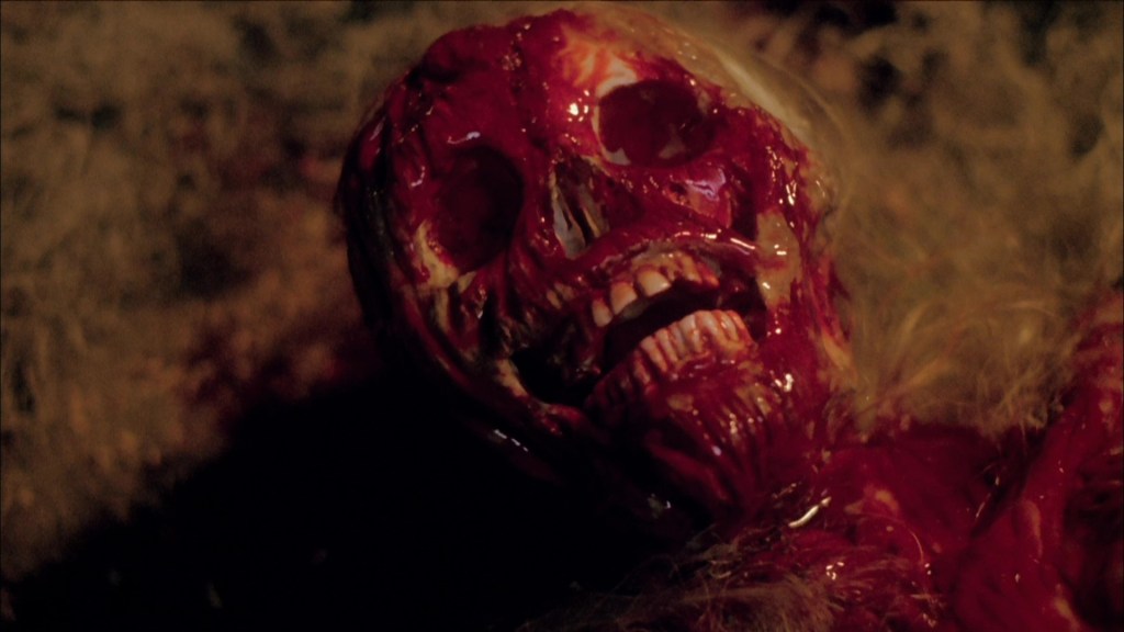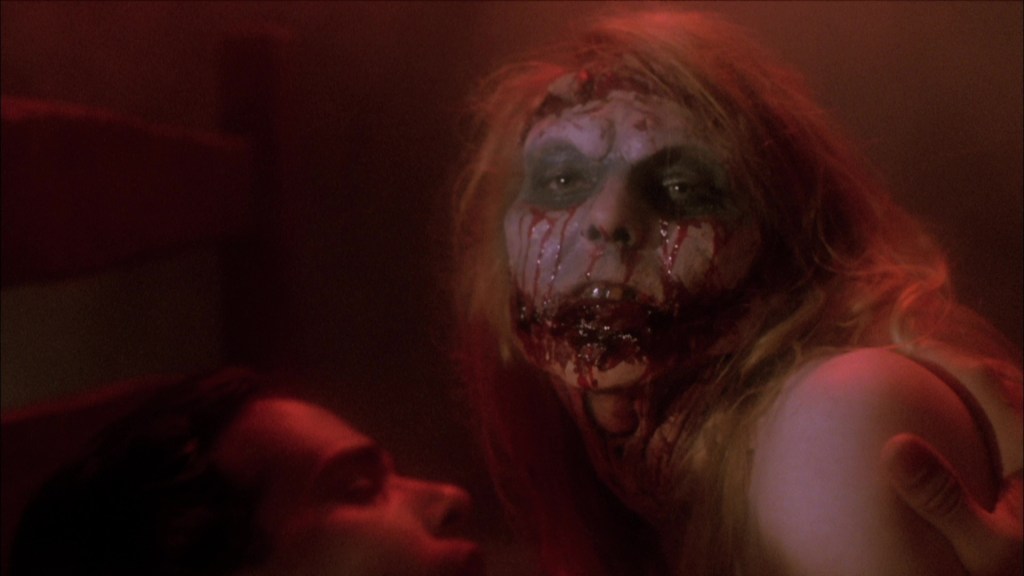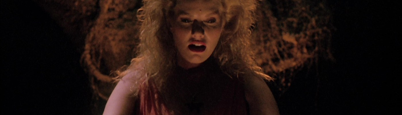 Gorgeously shot with a soft, dreamy sheen by his go-to DoP Zoran Hochstatter, and backed by a stunning orchestral score by Frederic Teetsel and Chuck Cirino, The Haunting of Morella represents a rare excursion into more serious-minded horror fare for Wynorski. Eschewing the tongue-in-cheek humour that typifies his most famous genre work, it’s no coincidence that two of Wynorski’s finest subsequent jolters, 976-EVIL II (1991) and Sorceress (1995), repurpose several of The Haunting of Morella’s ideas and scenes — specifically those that involve the blurred lines between fantasy and reality. Wynorski’s never-ending onslaught of macabre visuals are astounding. Measured, creepy, and crafted with tremendous flair and command, the gruesome, Barker-esque moment where Morella’s decomposed corpse (designed and fabricated by Dean and Star Jones) hisses that “[she]… Still… Lives!” is beautifully icky, and the sequence in which Lenora navigates a crimson-soaked hellscape is a marvellous, chunky blast of phantasmagoria [5]. As stated, Eggert is of decent value as Morella/Lenora — roles initially offered to Wynorski’s Not of This Earth lead Traci Lords — but it’s Wynorski’s swirling tech credentials that sell her predicament and ensuing existential crisis as she gets to grips with her tainted lineage.