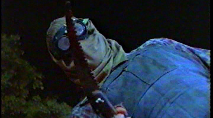 That old gardening implement did indeed become the cleaver of choice for a serial killer who’s terrorising the small Texas town of Pakoe, where slumber parties and sleepovers do little to quell the anxiety of twitchy town coroner Walt Parker (Joe Fishback), a fella whose step-daughter is of prime revelling age. Suspicion is immediately cast upon deformed local tree surgeon Charlie (Chuck Whiting), clad in the ubiquitous slasher favourite of dungarees and plaid shirt, as well as a fetching sack-cloth hood and a pair of aviator goggles – which clearly piqued the interest of Gabe Bartalos for his horror-comedy Skinned Deep (2004). Predictably, things aren’t exactly as they seem, so it’s up to the laid-back Sheriff (Kerry Knight) to discover the identity of the decapitating degenerate.