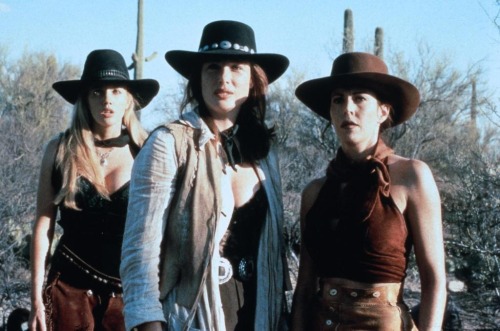 Sluggishly written by Karen Kelly — who’d previously penned A Woman Scorned (1993) and Illicit Dreams (1994) for Hard Bounty producer/frequent Wynorski collaborator Andrew Stevens — the thrust of the snail’s paced plot is muddy and full of dead air. Is the film about Richardson and Terlesky’s nefarious activities and how LeBrock and co. can stop ‘em? Or is it about LeBrock’s attempts to better her and her fellow working gals’ lives? Or bounty hunter Matt McCoy’s bullet-sprayed redemption, after initially vowing to holster his guns in the wake of a job gone wrong? Sadly, despite Wynorski and Kelly flirting with a rousing feminist bent and positioning Hard Bounty as a bawdier and edgier low-budget alternative to Johnathan Kaplan’s dreary cowgirl caper Bad Girls (1994), their aspirations are sunk the second they allow the McCoy strand to take a tighter and tighter hold, reducing LeBrock, Kelley, and Swanson to footnotes and suffocating the development of their fascinating dramatic arc. It’s a maddening and whopping great misstep, worsened by the fact that McCoy’s character is such a poorly sketched bore: a shoddy Eastwood facsimile who begins as a grizzled love interest for LeBrock, before shifting to an irritating white knight who continually swoops in to save the girls at the last minute.
