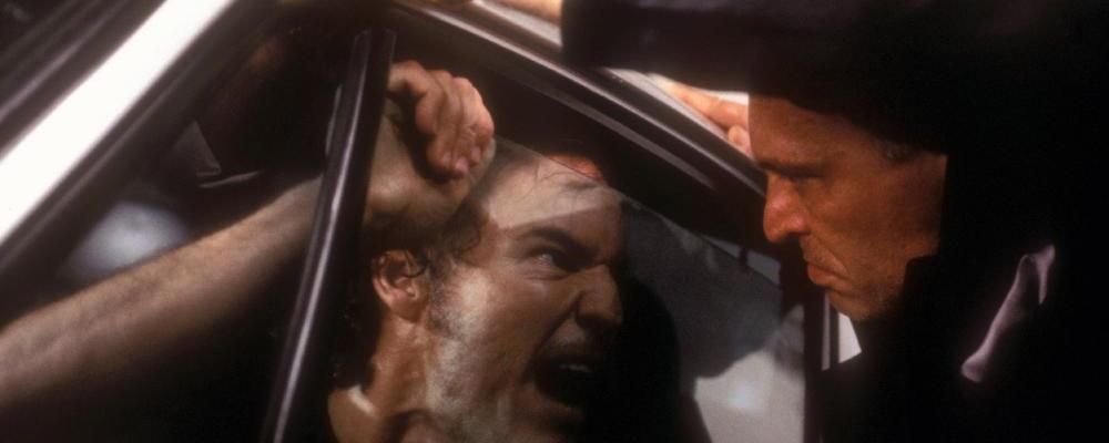 Imagine Cujo (1983) — but instead of Dee Wallace and her ailing son being menaced by a rabid St. Bernard, it’s some unsuspecting sod at the mercy of D-Fens from Falling Down (1993).