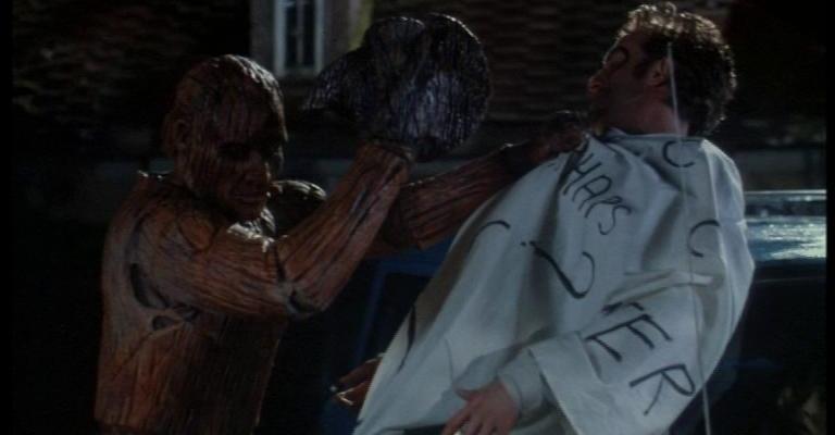 Thankfully, director Chris Angel atones for the undercooked plotting and half-baked narrative with a polished and energetic visual style. Having impressed Sims with his Academy Award-winning student short, Mr. October (1996), debuting feature helmer Angel — who’d go on to tackle a pair of sturdy sequels to the Craven-presented Wishmaster (1997), Wishmaster 3: Beyond the Gates of Hell (2001) and Wishmaster 4: The Prophecy Fulfilled (2004) — demonstrates a good feel for atmosphere and manages to fashion several striking images and compositions. Best, mind, is that he and cinematographer Brian Pearson actually know how to lens Morty (who’s this time played by make-up tech-cum-actor Jon Fedele). In The Fear, a blend of ugly photography and sloppiness on the part of FX designer John Carl Buechler caused the wicked wooden bastard to look exactly like what he was: a bloke in a bad rubber suit. Here, Buechler’s significantly superior, EC-flavoured retooling of the character is augmented by Angel and Pearson’s understanding of one of the make-up FX industry’s guiding principles: that in order for an effect to work, you’ve got to light it properly to begin with. Bonus points for giving Betsy ‘Pamela Voorhees’ Palmer a role.