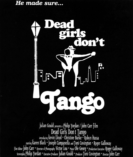 There’s no getting away from the fact that Dead Girls Don’t Tango is a mess. Carr, who directs and, in this case, edits as well, shows no capacity for either, with static and unimaginative staging (note how many times a scene is shot on the cinema staircase) and a lack of quality control – especially during a parade sequence which has been shakily filmed on a handheld camera with no consideration for lighting. Yordan’s script, meanwhile, seems to be channelling Edgar Wallace, albeit three decades too late. A motley ensemble – led by two debutants in Lloyd and Christine Burke – appear to be reading their lines at gunpoint, and scenes frequently finish with the most recondite and flat statements (“Music goes round and round. Where it stops, nobody knows”).