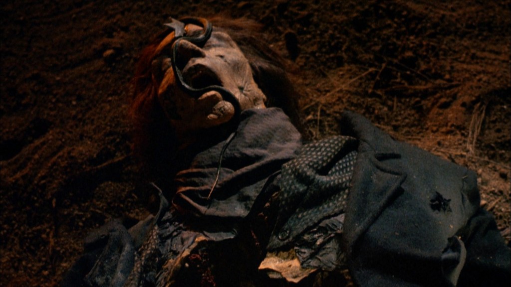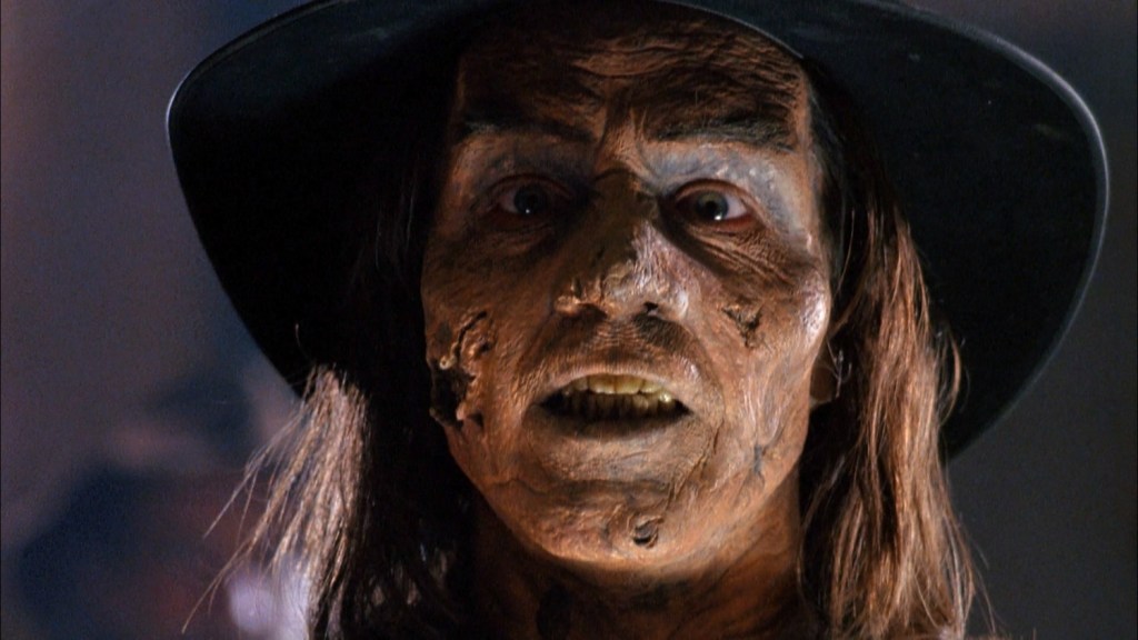 Sandefur – who’d go on to pen the lavish, Robert Englund-led Phantom of the Opera (1989) – certainly had the appropriate lineage to tackle Ghost Town. As well as the Tarantino-approved curio Poor Pretty Eddie (1975), Sandefur’s screenwriter father, B.W. Sandefur, has a litany of small screen Old West adventures to his credit, including episodes of Bonanza (1959-1973), The Virginian (1962-1971), and Little House on the Prairie (1975-1983) – the latter of which Duke even contributed to, writing the nineteenth episode of the show’s final season. Alas, Sandefur barely adds to Schmoeller’s woefully slight scenario. In it, a modern-day deputy (Franc Luz, The Nest (1988)) investigating the disappearance of a runaway bride (Catherine Hickland, Witchery (1988)) comes face-to-face with an undead evil lording over a long-abandoned frontier town: a cadaverous cowboy called Devlin (the late, great Jimmie F. Skaggs, a few months before his equally awesome turn as the big bad in Schmoeller’s Puppet Master), who’s trapped the spirits of this once thriving community in some kind of weird purgatory.