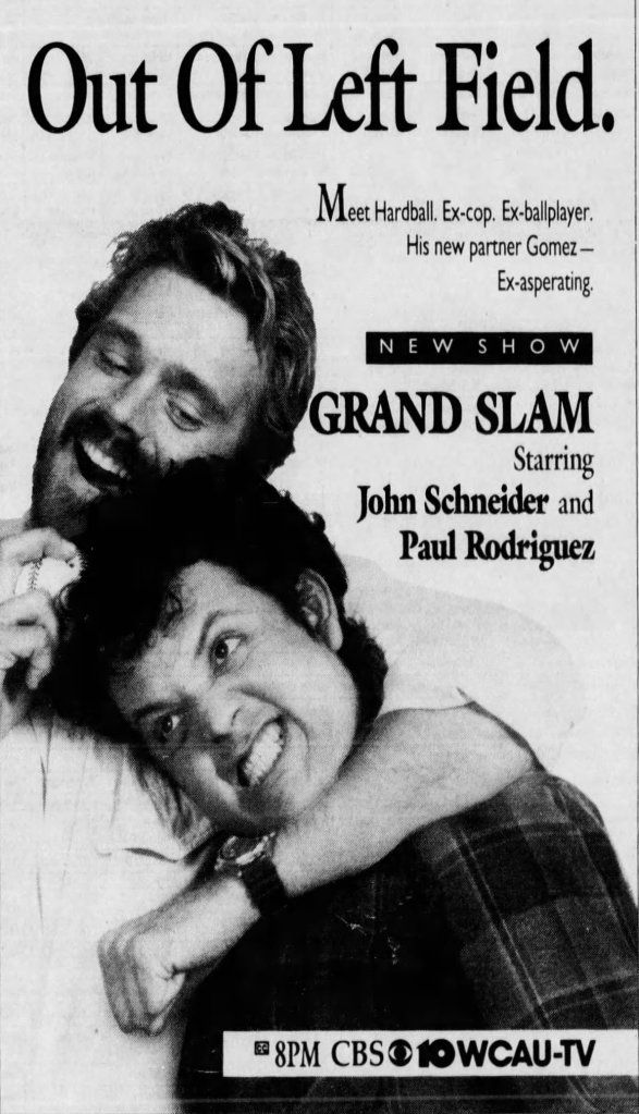 To that end, CBS elected to replace Beauty and the Beast with GRAND SLAM (1990): a buddy comedy about two bounty hunters employed by rival companies. Dennis ‘Hardball’ Bakelenekoff (John Schneider) wears ripped joggers, lives on a boat, and sleeps in his shades. He earned his nickname as a baseball player, and – eye roll at the ready – frequently resorts to taking down bad guys with the throw of a speedball. Pedro Gomez (Paul Rodriguez), meanwhile, is a compendium of every stereotypical Mexican character that you’ve ever seen, spending his time driving a low-rider and chowing down on burritos at the wheel.