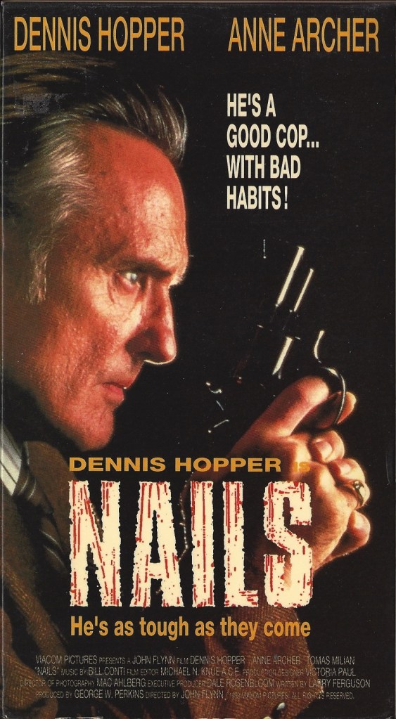 ‘Destined for theatrical release’ was how Nails was framed in a few previews, but Flynn’s film was a Viacom production for Showtime from the outset. Granted, it did flirt with cinemas in a few parts of Europe (“Hopper’s still a big star there,” noted Flynn) and north of the border in Canada – but, apart from that, Mac Ahlberg’s crisp cinematography could only be savoured on the small screen, when Nails aired on 25th July 1992.