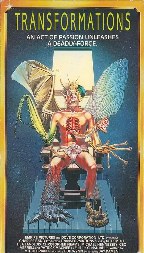 Tied with the entire oeuvre of Tim Kincaid as one of the most reviled titles in the Empire library, sci-shocker TRANSFORMATIONS was the second in a two picture deal between Charles Band and the Dove Corporation. Initially scheduled for distribution at the back end of 1988 by New World Pictures (who’d issued its Empire/Dove stablemate, Cellar Dweller (1987)), the film was among the many late-era flicks caught up in Empire’s collapse. Debuting on cassette in Japan in early ’89, Transformations surfaced on U.K. video via CBS/Fox in March 1990 — the same month Band’s final(ish) Empire romp, Robot Jox (1989), and his first Full Moon production, Puppet Master (1989), hit British shelves — and landed on U.S. tape in 1991 through bargain bin outfit Starmaker; a label that specialised in budget releases of New World’s catalogue, as it happens. Hardly prestigious but an infinitely better result than the workaround once suggested by the film’s director, Jay Kamen. An editor by trade, he wanted to comedically re-dub the project a la What’s Up, Tiger Lily? (1966) and flog it to Empire’s rival-cum-monopoliser, Trans World Entertainment. Seriously. [1]