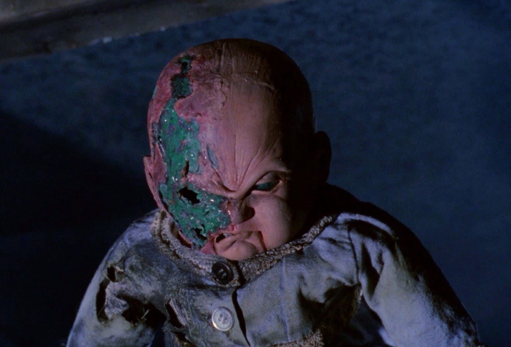 Essentially an extension of the ‘killer doll’ formula of previous Band-ers Dolls (1987) and Puppet Master (1989), Demonic Toys finds a pregnant cop (Tracy Scoggins), a grungy pizza delivery boy (Bentley Mitchum), and a few other folk battling the titular tiny terrors while trapped in an empty toy factory. Though mostly an enjoyable lark, some of the Stephen King-esque supernatural elements are heavy-handed and basic, the overarching idea being that the events in the factory are part of a deeper, more eternal battle between good and evil. However, Band’s preference for simplistic, easily cheerable and boo-able heroes and villains, as well as his obsession with dense mythology that can be siphoned into sequels and spin-offs, is enlivened by the darker aspects of Goyer’s screenplay and Manoogian’s bombastic direction.