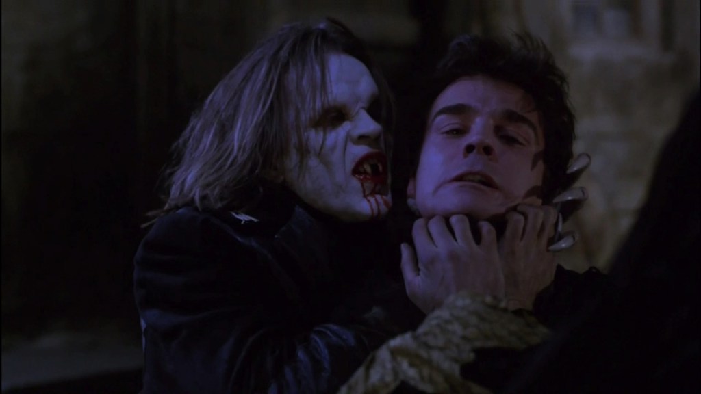 Nicolaou’s trump card is Hove’s Radu. Clad in some incredible Greg Cannom make-up effects (aesthetically, the character is among the most recognisable sights in the Full Moon universe), the Danish actor has a ball, unleashing a rasping, spidery turn that lends Subspecies pomp and creepiness in equal measure. A marvellous villain, there are traces of Lugosi, Lee, Kinski, and Schreck in Hove’s portrayal, but his timbre and gait has proven similarly influential, with Stephen Dorff, Thomas Ian Griffith, and Richard Roxburgh Radu-ing it to varying degrees in Blade (1998), John Carpenter’s Vampires (1998), and the much-maligned Van Helsing (2004).