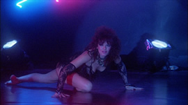 Hinging on the same ‘female cop goes undercover as an exotic dancer’ premise as Trans World Entertainment’s Catch the Heat (1987) (here, mind, the device is deliberately employed to mirror the killer’s M.O.), Stripped to Kill’s dramatic clout is defined by its rich character focus. Shea’s later standouts – Dance of the Damned, Streets, Poison Ivy (1992), the aforementioned Carrie 2 – teem with shockingly honest depictions of flawed individuals desperately seeking meaning and purpose; an auteur flourish Stripped to Kill clearly established. And though, as a collective, the denizens of Shea’s cinema tend to exude a cartoon-y bolshiness and exhibit a few extravagant tics and wrinkles, the bulk are nonetheless relatable. Again, Stripped to Kill lays the groundwork. The gimmickry of the killer’s presentation – which, in addition to the role’s De Palma and Argento winks, invokes the Psycho (1960) universe as well – is juxtaposed with their weighty psychological motivations; and the ‘tough cookie’ attitude of star Kay Lenz’s tomboy detective is a shield deployed by a complicated, vulnerable woman reluctant to let her guard down. In a satisfying bit of symmetry, the killer and Lenz – who, essentially, does the inverse of the perp she’s chasing, becoming more openly feminine – are both pretending to be something they’re not in order to thwart their loneliness. Shea and, indeed, co-scripter/producer Andy Ruben, would continue to harness parallel character development techniques in their equally well-written mini-epics Dance of the Damned and Streets.